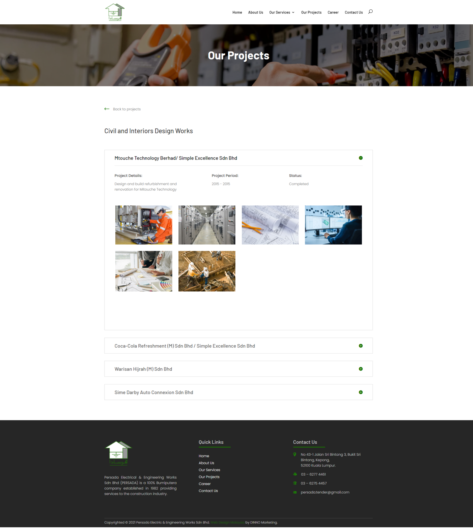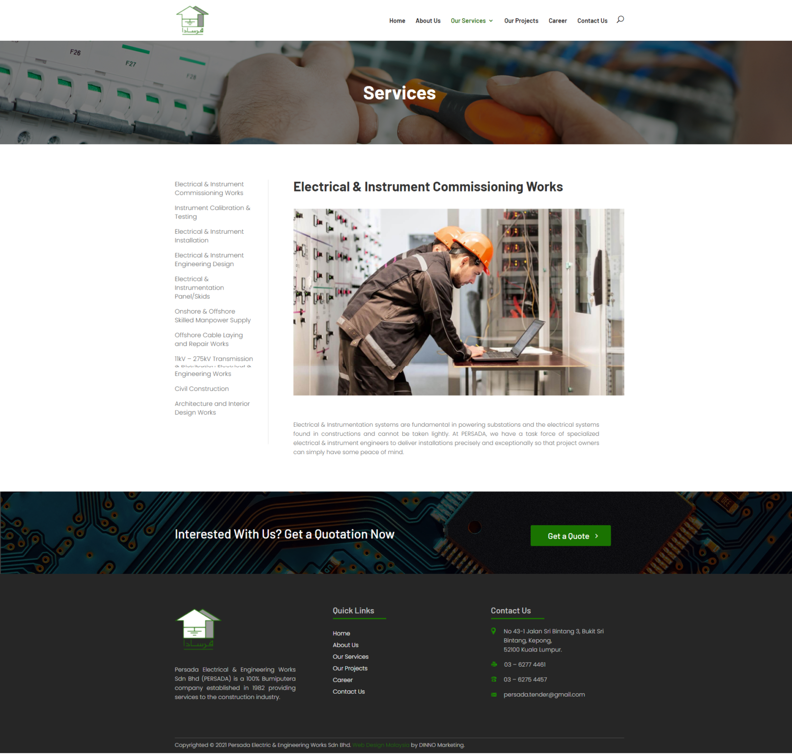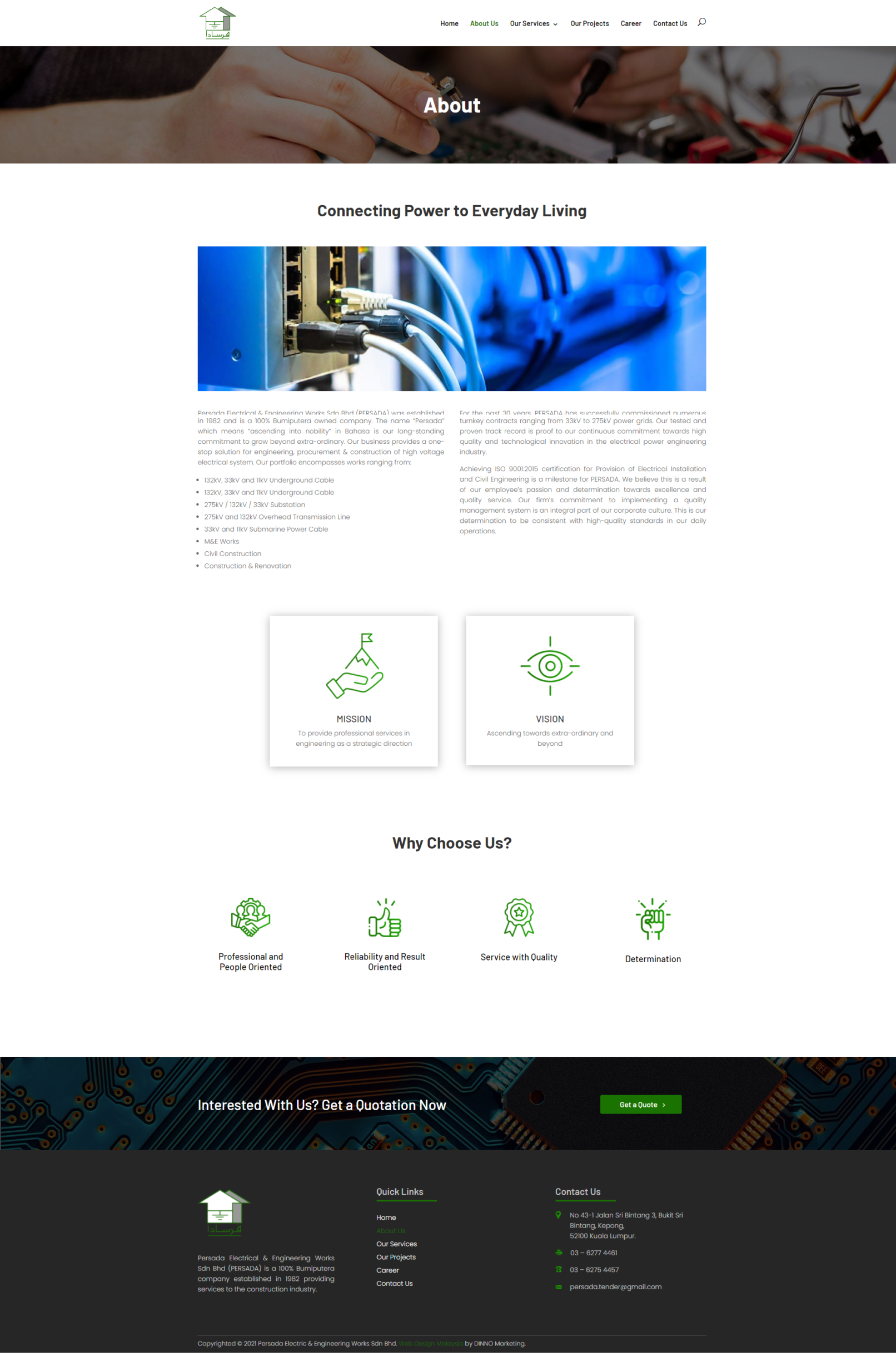 Persada Electrical & Engineering Works Sdn Bhd (PERSADA) is a 100% Bumiputera company established in 1982 providing services to the construction industry in the Electrical & Mechanical Engineering, Civil Works, Oil & Gas and Telecommunication business sectors.