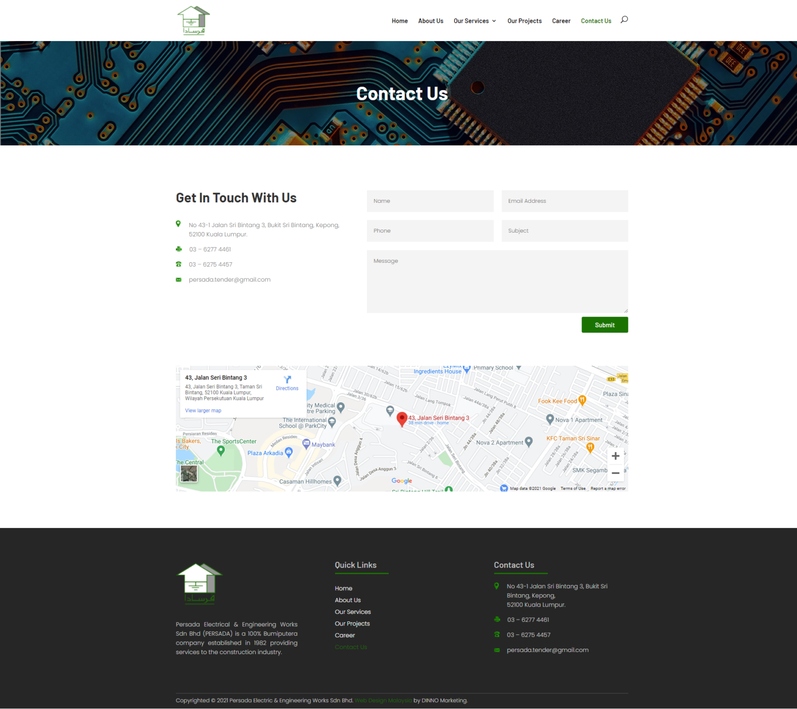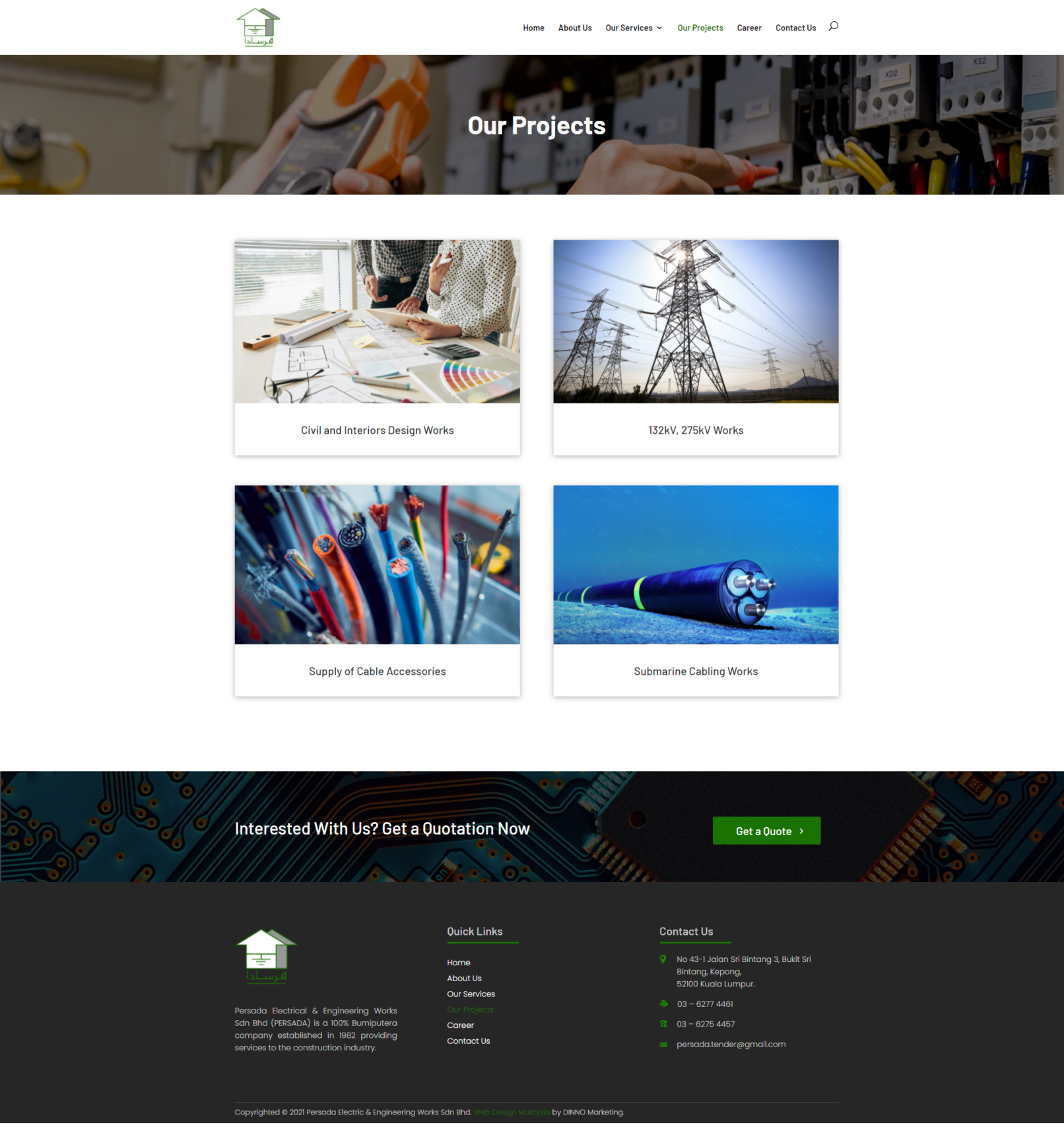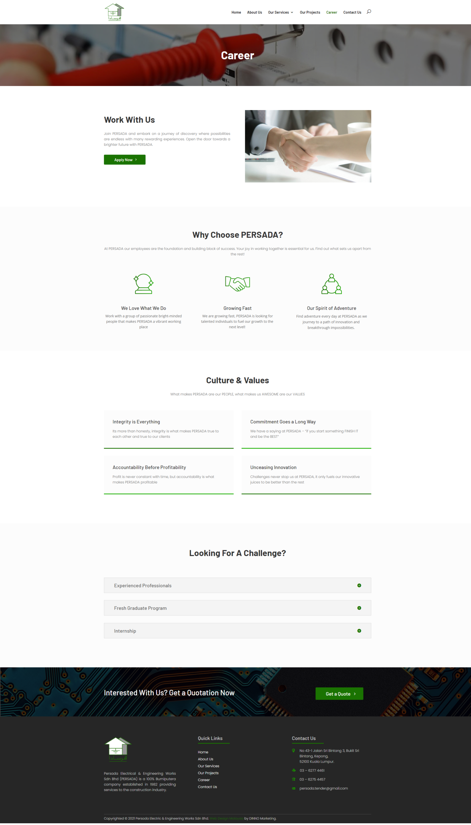 Persada Electrical & Engineering Works Sdn Bhd (PERSADA) is a 100% Bumiputera company established in 1982 providing services to the construction industry in the Electrical & Mechanical Engineering, Civil Works, Oil & Gas and Telecommunication business sectors.